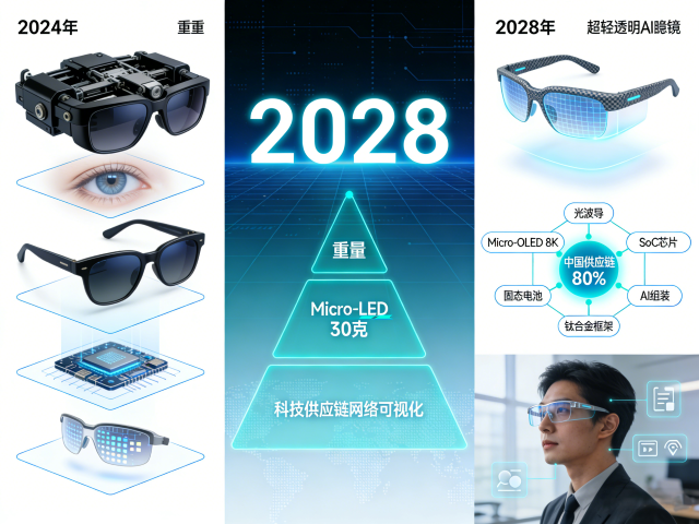 形态隐形(普通眼镜级): 重量降至30-35克(普通近视眼镜10-20克),外观与传统眼镜无异,可全天候佩戴而不产生压迫感。这是2028年行业公认可达成的目标。