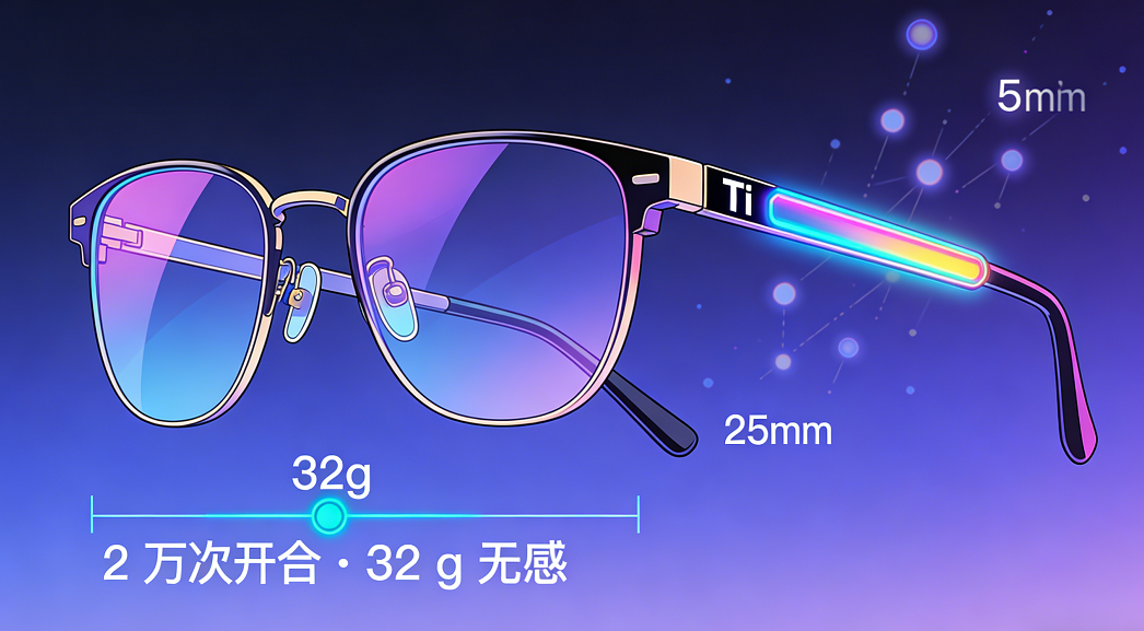 开合 2 万次不变形,整镜 32 g,比上一代降低 7 g,佩戴“无感”。